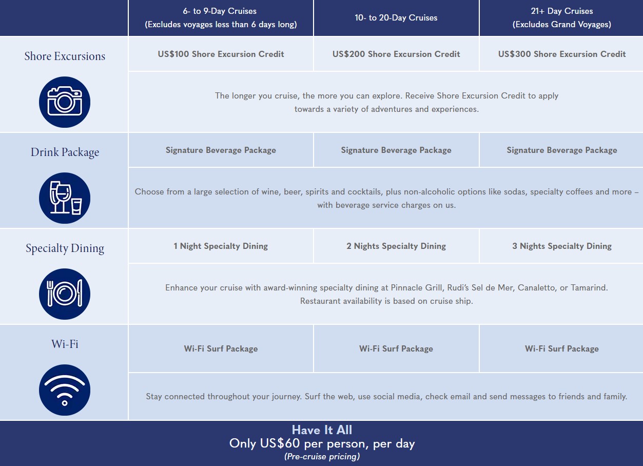 Specialty Dining is based on cruise duration and ship type. For 6- to 9-day cruises, guests will receive one night at Pinnacle Grill, Rudi’s Sel de Mer, Canaletto, or Tamarind. For ships without Rudi’s Sel de Mer or Tamarind, guests will receive one night at Pinnacle Grill or Canaletto. For 10- to 20-day cruises, guests will receive two nights: one night at Pinnacle Grill or Rudi’s Sel de Mer and one night at Canaletto or Tamarind. For ships without Tamarind, guests will receive two nights: one night at Pinnacle Grill and one night at Canaletto. For 21+ day cruises (excluding Grand Voyages),guests will receive three nights: one night at Pinnacle Grill, one night at Tamarind, and one night at Canaletto. For ships without Tamarind, guests will receive three nights: two nights at Pinnacle Grill and one night at Canaletto. Offer excludes Specialty Dining events in Pinnacle Grill or Tamarind such as Morimoto by Sea and Cellar Master Dinner. Reservations and dining times will be available to pre-reserve. Shore Excursion offer is based on cruise duration and is per person, not per stateroom. For Alaska cruisetours and 6- to 9-day cruises, eligible guests will receive US$100 Shore Excursion Credit to apply toward their Shore Excursion purchase(s). For 10- to 20-day cruises, eligible guests will receive US$200 Shore Excursion Credit to apply toward their Shore Excursion purchase(s). For 21+ day cruises (excluding Grand Voyages), eligible guests will receive US$300 Shore Excursion Credit to apply toward their Shore Excursion purchase(s). Shore Excursion Credit must be used pre-cruise when applied toward an Alaska Cruisetour